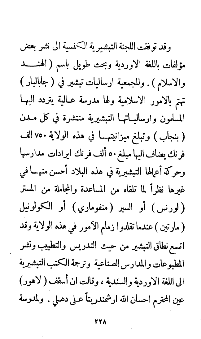 وقد توفقت اللجنة التبشيرية الكنسية إلى نشر بعض مؤلفات باللغة الأوردية وبحث طويل باسم " الهند والإسلام " وللجمعية إرساليات تبشير في (جابالبار) تهتم بالأمور الإسلامية ولها مدرسة عالية يتردد إليها المسلمون، وإرسالياتها التبشيرية منتشرة في كل مدن (بنجاب) وتبلغ ميزانيتها في هذه الولاية 750 ألف فرنك يضاف إليها مبلغ 50 ألف فرنك إيرادات مدارسها. وحركة أعمالها التبشيرية في هذه البلاد أحسن منها في غيرها نظرًا لما تلقاه من المساعدة والمجاملة من المستر (لورنس) أو السير (منفوماري) أو الكولونيل (مارتين) عندما تقلدوا زمام الأمور في هذه الولاية وقد اتسع نطاق التبشير من حيث التدريس والتطبيب ونشر المطبوعات والمدارس الصناعية وترجمة الكتب التبشيرية إلى اللغة الأوردية والسندية، وقالت إن أسقف (لاهور) عين المحترم إحسان الله أرشمندريتًا على دهلي، ولمدرسة