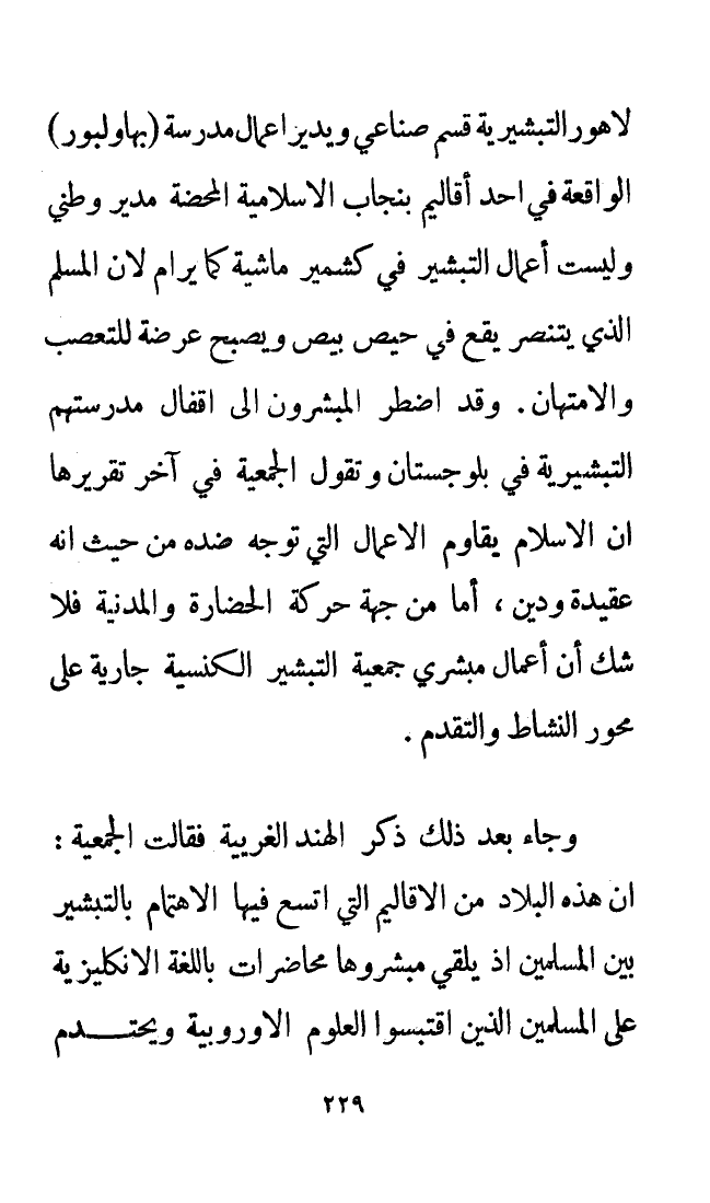 لاهور التبشيرية قسم صناعي ويدير أعمال مدرسة (بهاولبور) الواقعة في أحد أقاليم بنجاب الإسلامية المحضة مدير وطني وليست أعمال التبشير في كشمير ماشية كما يرام لأن المسلم الذي يتنصر يقع في حيص بيص ويصبح عرضة للتعصب والامتهان. وقد اضطر المُبَشِّرُونَ إلى إقفال مدرستهم التبشيرية في بلوشستان وتقول الجمعية في آخر تقريرها إن الإسلام يقاوم الأعمال التي توجه ضده من حيث أنه عقيدة ودين، أما من جهة حركة الحضارة والمدنية فلا شك أن أعمال مبشري جمعية التبشير الكنسية جارية على محور النشاط والتقدم.