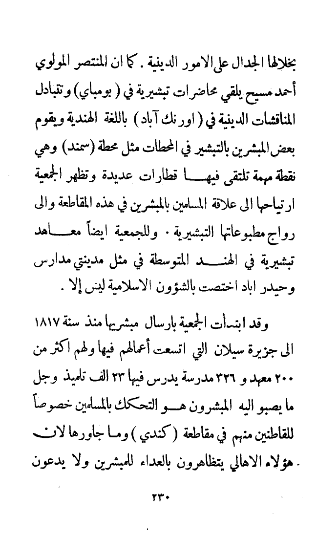 بخلالها الجدال على الأمور الدينية. كما أن المتنصر المولوي أحمد مسيح يلقي محاضرات تبشيرية في (بومباي) وتتبادل المناقشات الدينية في (أورنك آباد) باللغة الهندية ويقوم بعض المُبَشِّرِينَ بالتبشير في المحطات مثل محطة (سمند) وهي نقطة مهمة تلتقي فيها قطارات عديدة وتظهر الجمعية ارتياحها إلى علاقة المسلمين بالمُبَشِّرِينَ في هذه المقاطعة وإلى رواج مطبوعاتها التبشيرية. وللجمعية أيضًا معاهد تبشيرية في الهند المتوسطة في مثل مدينتي مدراس وحيدر آباد اختصت بالشؤون الإسلامية ليس إلا.