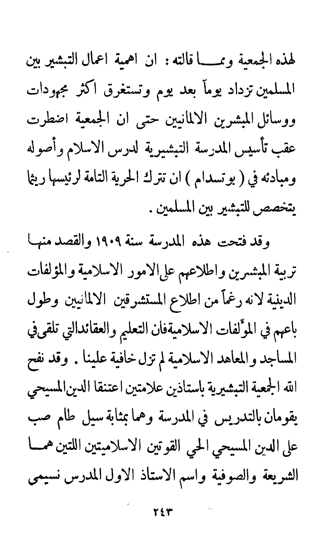 لهذه الجمعية ومما قالته: إن أهمية أعمال التبشير بين المسلمين تزداد يومًا بعد يوم وتستغرق أكثر مجهودات ووسائل المُبَشِّرِينَ الألمانيين حتى إن الجمعية اضطرت عقب تأسيس المدرسة التبشيرية لدرس الإسلام وأصوله ومبادئه في (بوتسدام) أن تترك الحرية التامة لرئيسها ريثما يتخصص للتبشير بين المسلمين.