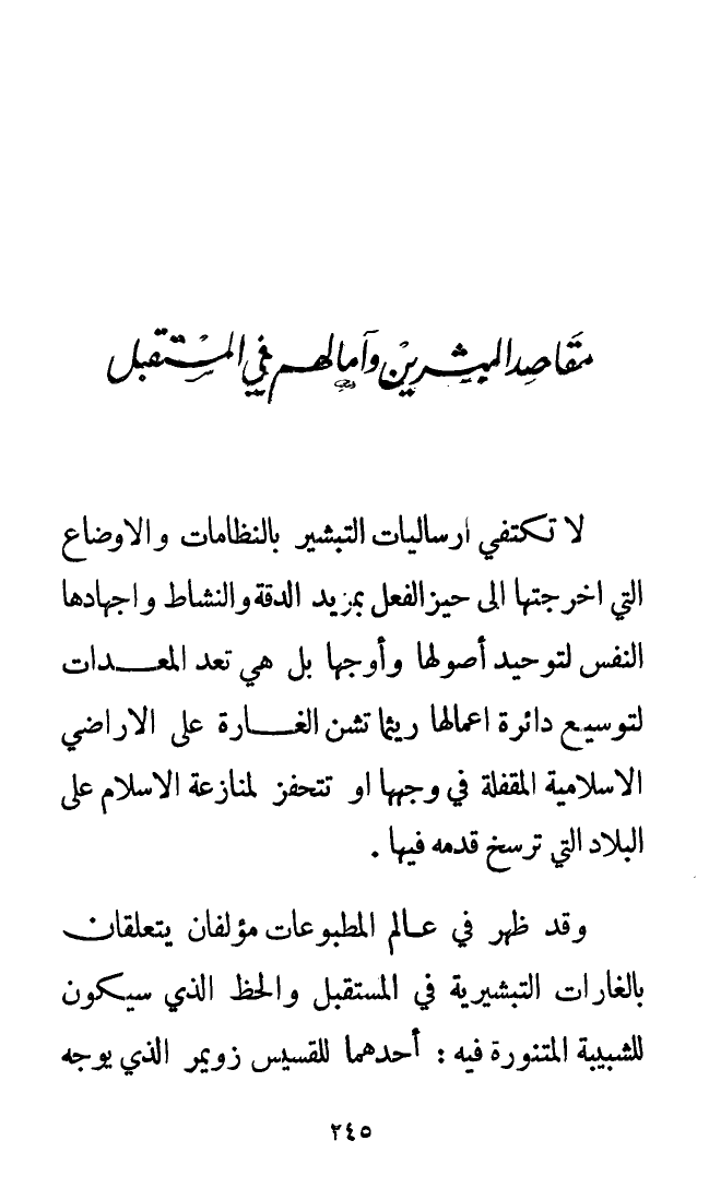 وقد ظهر في عالم المطبوعات مؤلفان يتعلقان بالغارات التبشيرية في المستقبل والحظ الذي سيكون للشبيبة المتنورة فيه: أحدهما القسيس زويمر الذي يوجه