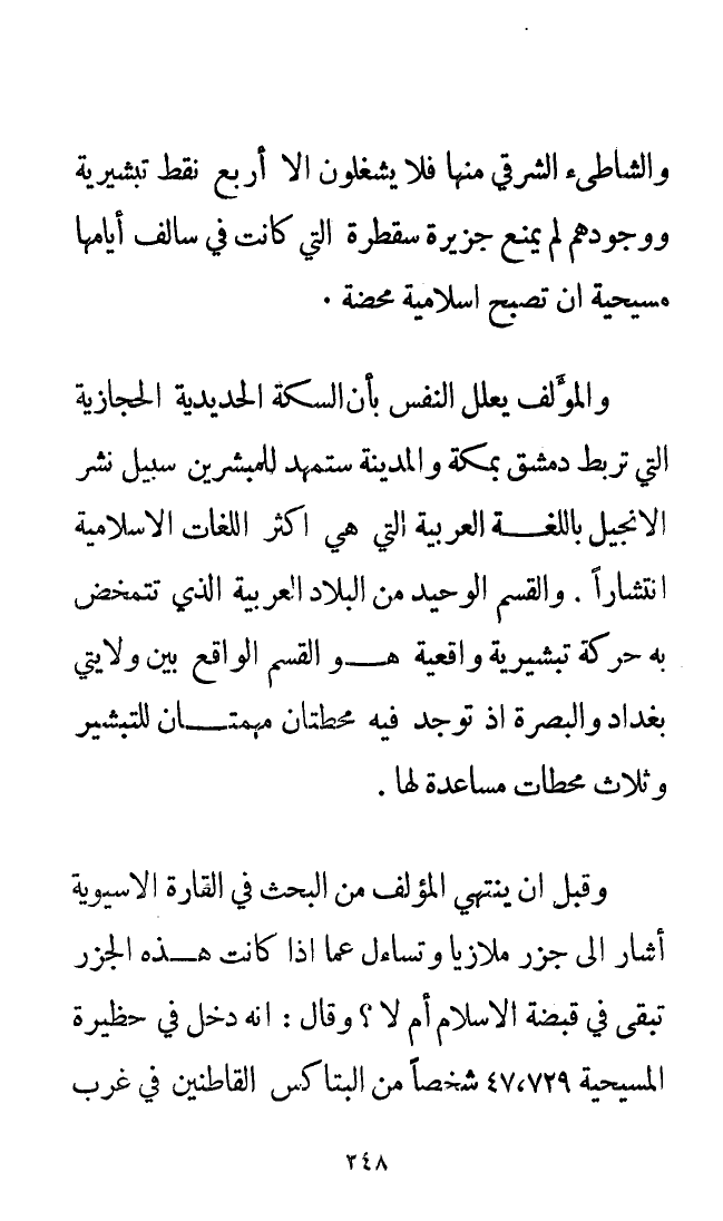 والمؤلف يعلل النفس بأن السكة الحديدية الحجازية التي تربط دمشق بمكة والمدينة ستمهد للمبشرين سبيل نشر الإنجيل باللغة العربية التي هي أكثر اللغات الإسلامية انتشارًا. والقسم الوحيد من البلاد العربية التي تتمخض به حركة تبشيرية واقعية هو القسم الواقع بين ولايتي بغداد والبصرة إذ توجد فيه محطتان مهمتان للتبشير وثلاث محطات مساعدة لها.