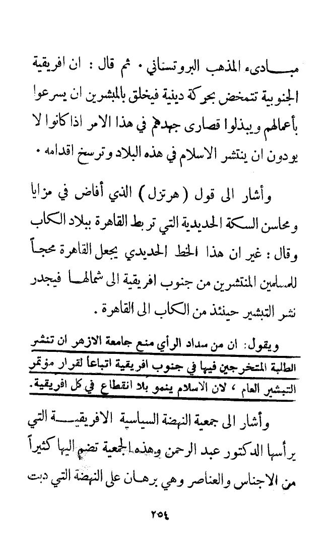 ويقول: إن من سداد الرأي منع جامعة الأزهر أن تنشر الطلبة المتخرجين فيها في جنوب أفريقيا اتباعًا لقرار مؤتمر التبشير العام، لأن الإسلام ينمو بلا انقطاع في كل أفريقيا.
