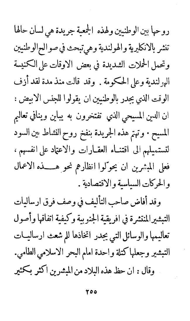 روحها بين الوطنيين ولهذه الجمعية جريدة هي لسان حالها تنشر بالإنكليزية والهولندية وهي تبحث في صوالح الوطنيين وتحمل الحملات الشديدة في بعض الأوقات على الكنيسة الهولندية وعلى الحكومة. وقد قالت منذ مدة لقد أزف الوقت الذي يجدر بالوطنيين أن يقولوا للجنس الأبيض إن الدين المسيحي الذي تفتخرون به يباين وينافي تعاليم المسيح. وتهتم هذه الجريدة بنفخ روح النشاط بين السود لتستميلهم إلى اقتناء العقارات والاعتماد على أنفسهم، فعلى المُبَشِّرِينَ أن يحولوا أنظارهم نحو هذه الأعمال والحركات السياسية والاقتصادية. وقد أفاض صاحب التأليف في وصف فرق إرساليات التبشير المنتشرة في أفريقيا الجنوبية وكيفية اتفاقها وأصول تعاليمها والوسائل التي يجدر اتخاذها للم شعث إرساليات التبشير وجعلها كتلة واحدة أمام البحر الإسلامي الطامي.