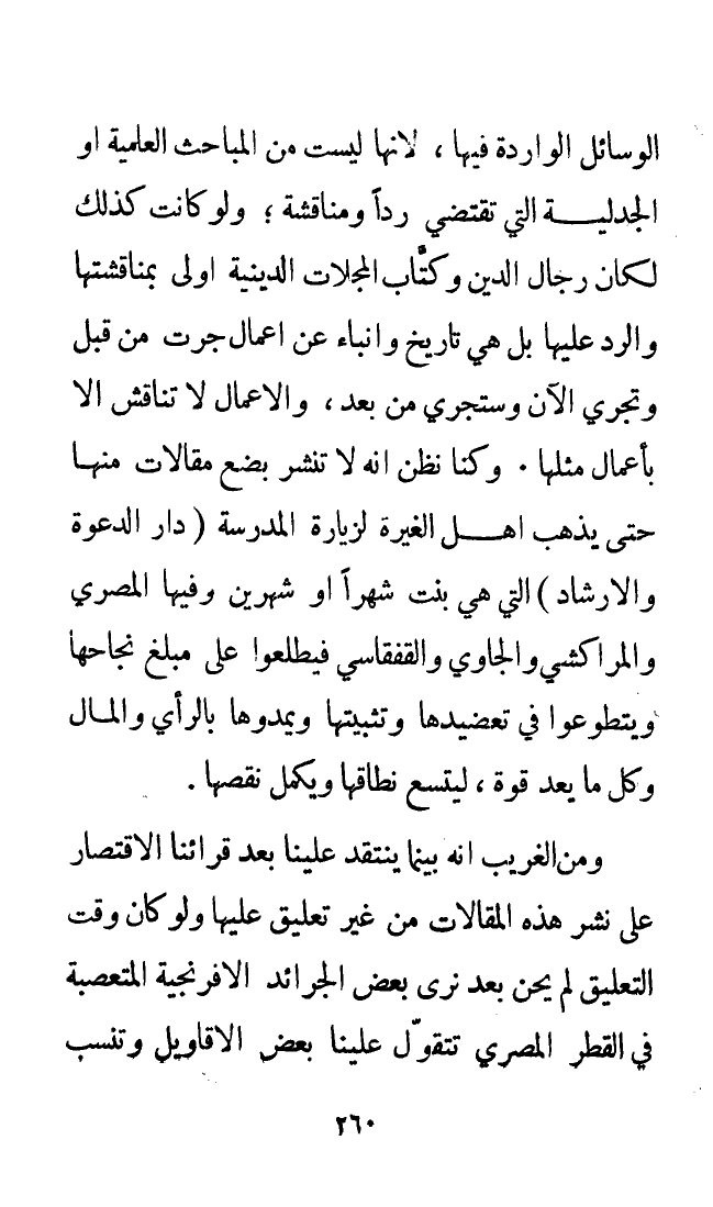 الوسائل الواردة فيها، لأنها ليست من المباحث العلمية أو الجدلية التي تقتضي رَدًّا ومناقشة، ولو كانت كذلك لكان رجال الدين وكتاب المجلات الدينية أولى بمناقشتها والرد عليها بل هي تاريخ وأنباء عن أعمال جرت من قبل وتجري الآن وستجرى من بعد، والأعمال لا تناقش إلا بأعمال مثلها. وكنا نظن أنه لا تنشر بضع مقالات منها حتى يذهب أهل الغيرة لزيارة مدرسة " دار الدعوة والإرشاد " التي هي بنت شهرًا أو شهرين وفيها المصري والمراكشي والجاوي والقفقاسي فيطلعوا على مبلغ نجاحها ويتطوعوا في تعضيدها وتثبيتها ويمدوها بالرأي والمال وكل ما يعد قوة، ليتسع نطاقها ويكمل نقصها.