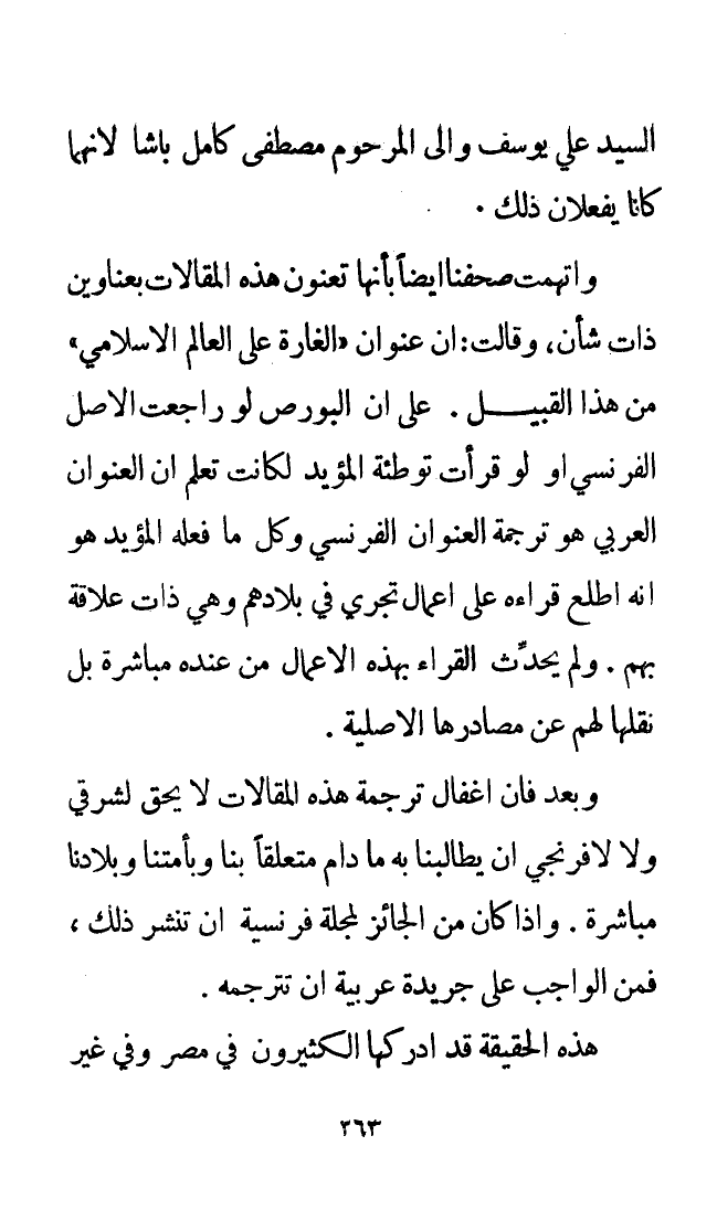 وبعد، فإن إغفال ترجمة هذه المقالات لا يحق لشرقي ولا لإفرنجي أن يطالبنا به ما دام متعلقًا بنا وبأمتنا وبلادنا مباشرة، وإذا كان من الجائز لمجلة فرنسية أن تنشر ذلك، فمن الواجب على جريدة عربية أن تترجمه.