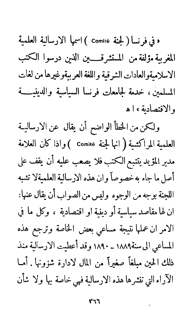 ولكن من الخطأ الواضح أن يقال عن الإرسالية العلمية المراكشية أنها (لجنة Comité) وإذا كان العلامة مدير " المؤيد " يتتبع الكتب فلا يصعب عليه أن يقف على أصل ما جاء به خصوصًا وأن هذه الإرسالية العلمية لا تشبه اللجنة بوجه من الوجوه وليس من الصواب أن يقال عنها: إن لها مقاصد سياسية أو دينية أو اقتصادية، وكل ما في الأمر أن عملها نتيجة مساعي بعض الخاصة، وترجع هذه المساعي إلى سنة 1889 - 1895 وقد أعطيت الإرسالية منذ ذلك الحين مبلغًا صغيرًا من المال لإدارة شؤونها، أما الآراء التي تنشرها هذه الإرسالية فهي خاصة بها ولا شأن