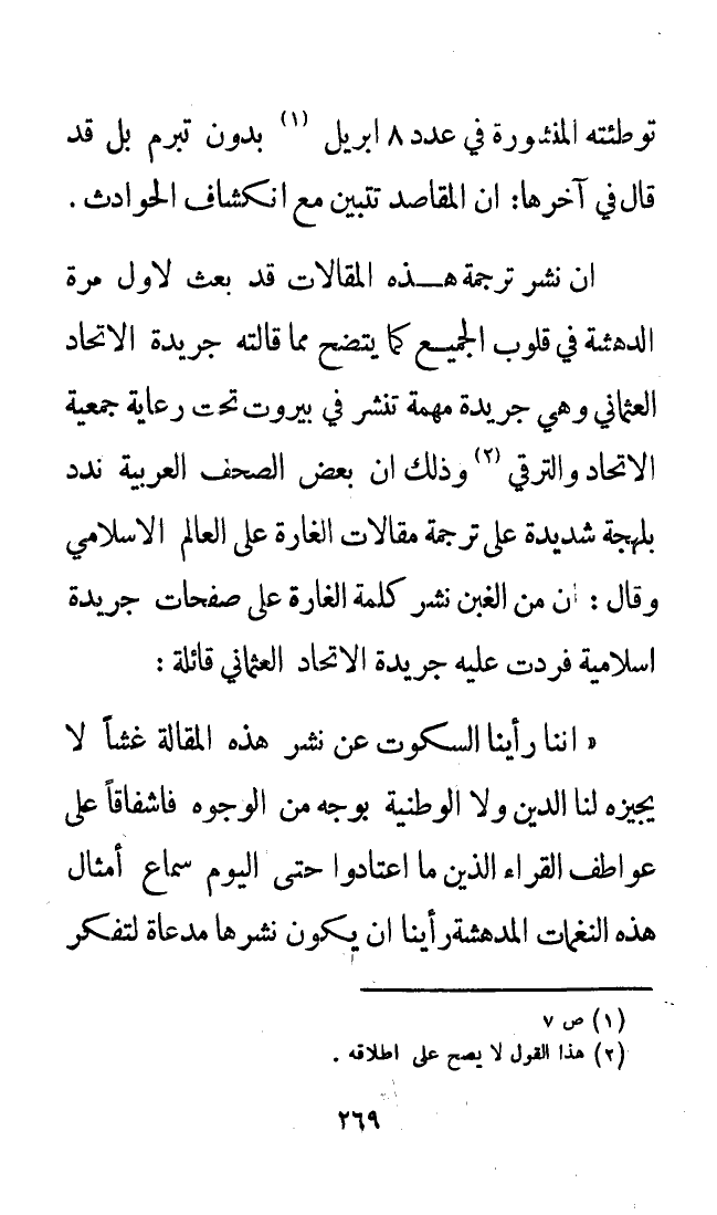 إن نشر ترجمة هذه المقالات قد بعث لأول مرة الدهشة في قلوب الجميع كما يتضح مما قالته جريدة " الاتحاد العثماني " وهي جريدة مهمة تنشر في بيروت تحت رعاية جمعية الاتحاد والترقي (¬2) وذلك أن بعض الصحف العربية ندد بلهجة شديدة على ترجمة مقالات " الغارة على العالم الإسلامي " وقال: إن من الغبن نشر كلمة الغارة على صفحات جريدة إسلامية، فردت عليه جريدة " الاتحاد العثماني " قائلة: