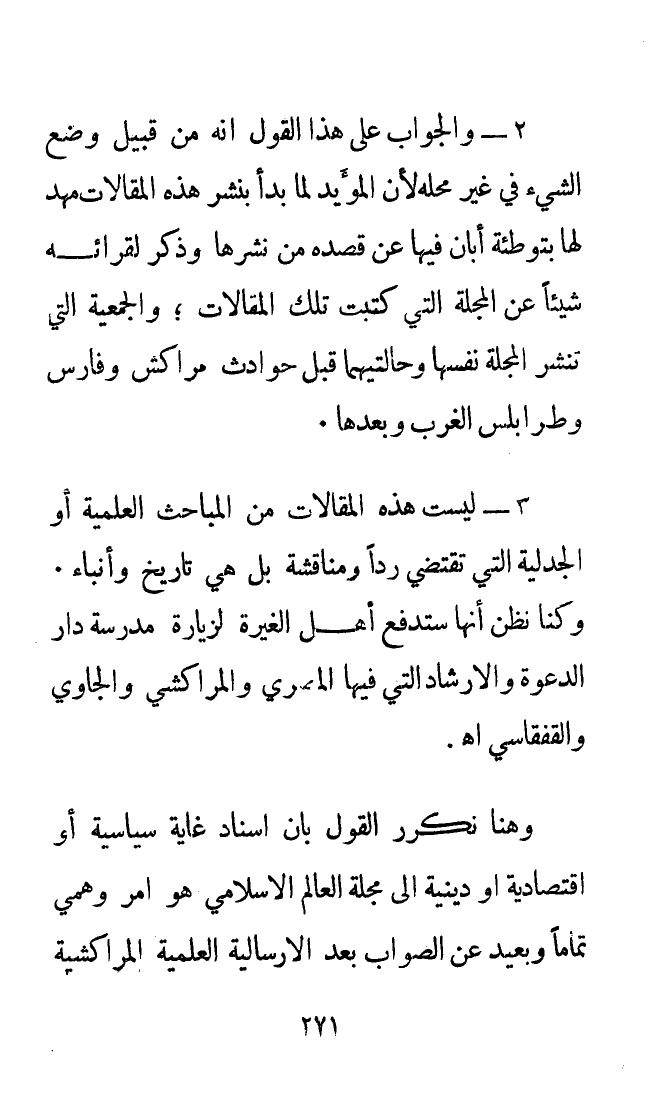 وهنا نكرر القول بأن إسناد غاية سياسية أو اقتصادية أو دينية إلى مجلة " العالم الإسلامي " هو أمر وهمي تمامًا وبعيد عن الصواب بُعْدَ الإرسالية العلمية المراكشية
