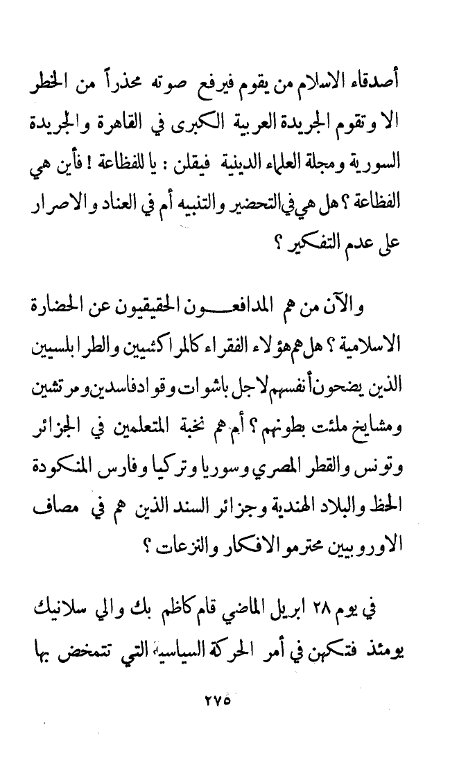 أصدقاء الإسلام من يقوم فيرفع صوته مُحَذِّرًا من الخطر إلا وتقوم الجريدة العربية الكبرى في القاهرة والجريدة السورية ومجلة العلماء الدينية فيقلن: يا للفظاعة! فأين هي الفظاعة؟ هل هي في التحذير والتنبيه أم في العناد والإصرار على عدم التفكير؟