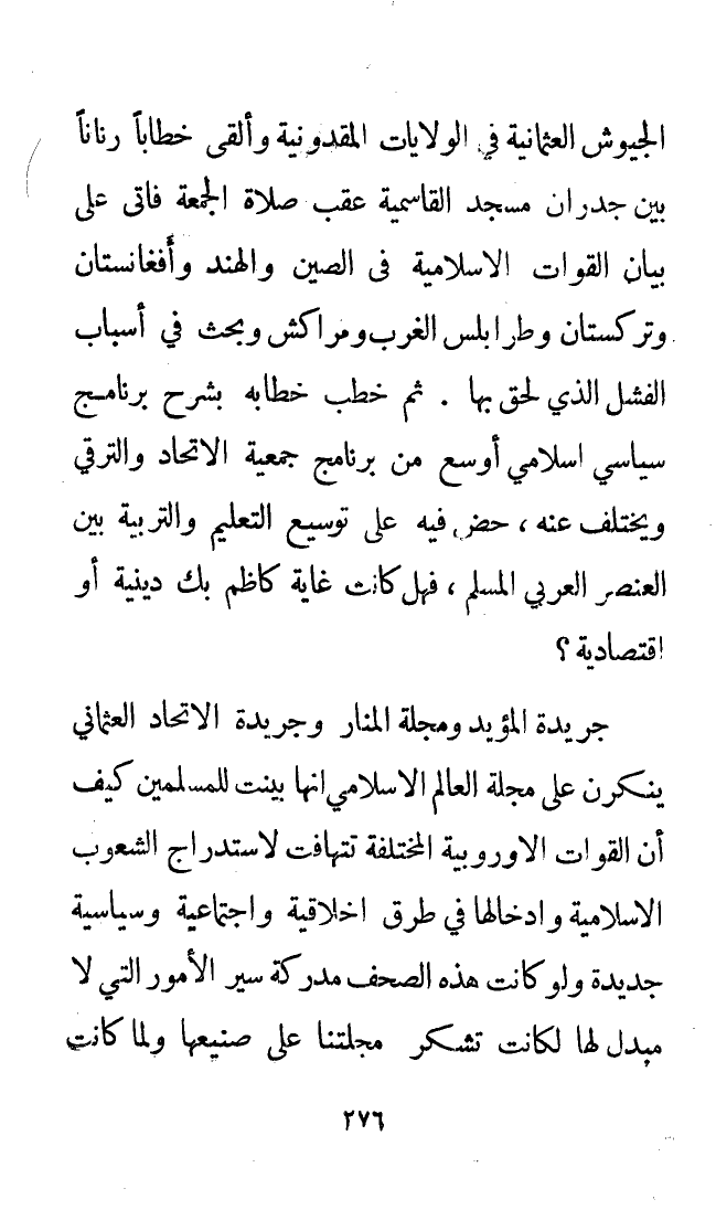 الجيوش العثمانية في الولايات المقدونية وألقى خطابًا رنانًا بين جدران مسجد القاسمية عقب صلاة الجمعة فأتى على بيان القوات الإسلامية في الصين والهند وأفغانستان وتركستان وطرابلس الغرب ومراكش، وبحث في أسباب الفشل الذي لحق بها. ثم ختم خطابه بشرح برنامج سياسي إسلامي أوسع من برنامج جمعية الاتحاد والترقي ويختلف عنه، حض فيه على توسيع التعليم والتربية بين العنصر العربي المسلم، فهل كانت غاية كاظم بك دينية أو اقتصادية؟