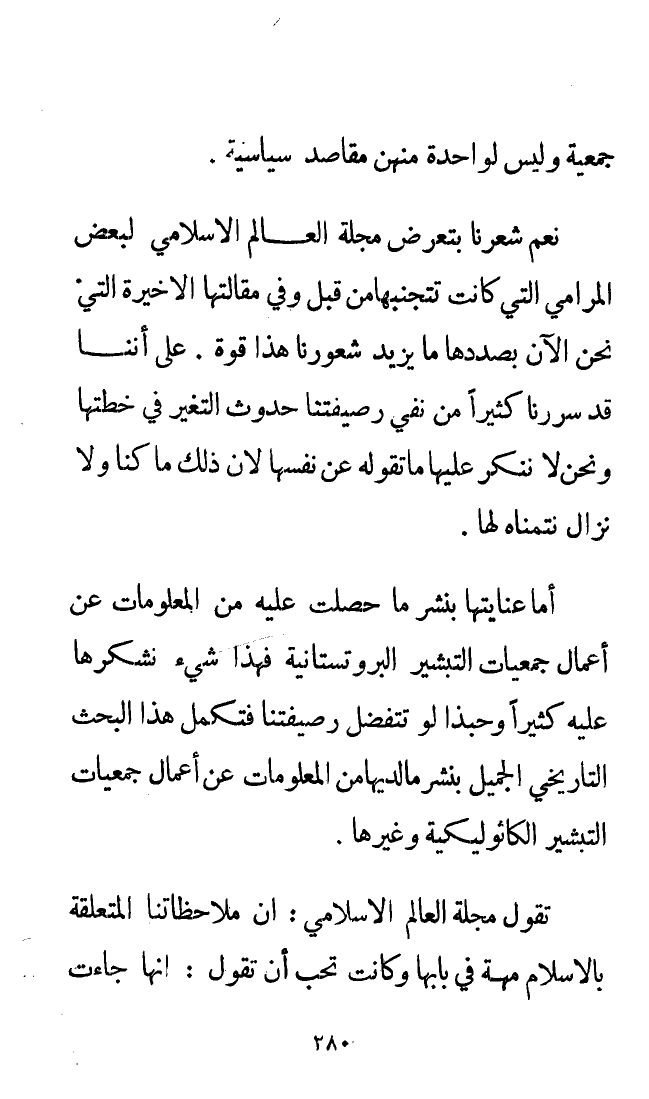 أما عنايتها بنشر ما حصلت عليه من المعلومات عن أعمال جمعيات التبشير البروتستانتية فهذا شيء نشكرها عليه كثيرًا وحبذا لو تتفضل رصيفتنا فتكمل هذا البحث التاريخي الجميل بنشر ما لديها من المعلومات عن أعمال جمعيات التبشير الكاثوليكية وغيرها.
