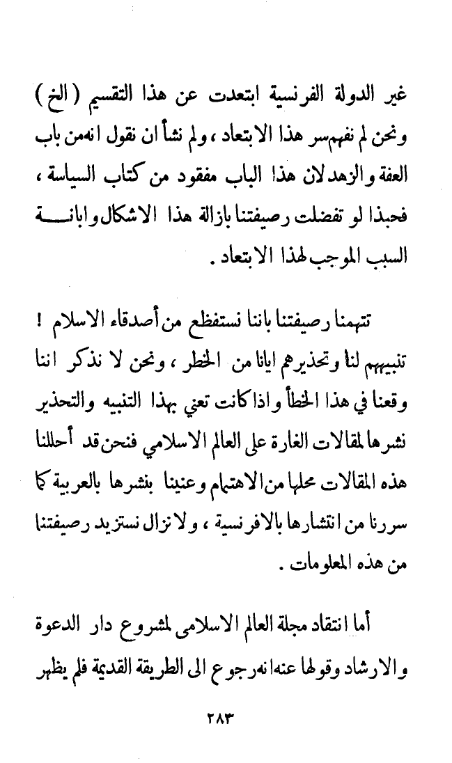 تتهمنا رصيفتنا بأننا نستفظع من أصدقاء الإسلام! تنبيههم لنا وتحذيرهم إيانا من الخطر، ونحن لا نذكر أننا وقعنا في هذا الخطأ وإذا كانت تعني بهذا التنبيه والتحذير نشرها لمقالات " الغارة على العالم الإسلامي " فنحن قد أحللنا هذه المقالات محلها من الاهتمام وعنينا بنشرها بالعربية كما سررنا من انتشارها بالفرنسية، ولا نزال نستزيد رصيفتنا من هذه المعلومات.