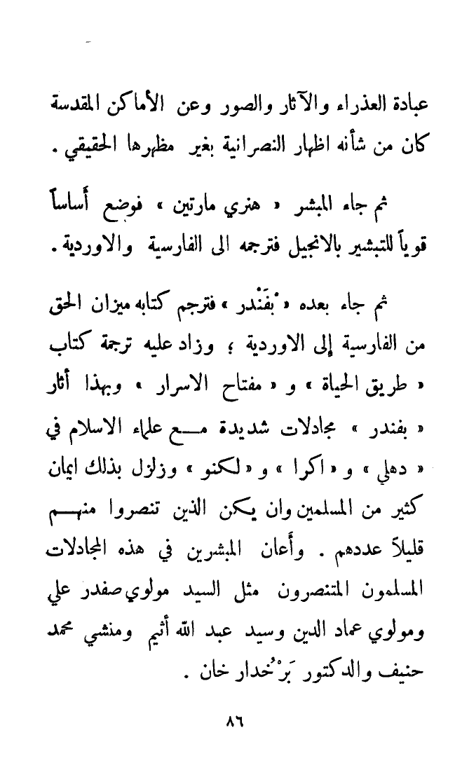 ثم جاء بعده «بفندر» فترجم كتابه " ميزان الحق " من الفارسية إلى الأوردية؛ وزاد عليه ترجمة كتاب " طريق الحياة " و" مفتاح الأسرار "، وبهذا أثار «بفندر» مجادلات شديدة مع علماء الإسلام في «دهلي» و «أكرا» و «لكنو» وزلزل بذلك إيمان كثير من المسلمين وإن يكن الذين تنصروا منهم قليلاً عددهم. وأعان المُبَشِّرِينَ في هذه المجادلات المسلمون المُتَنَصَّرونَ مثل السيد مولوي صفدر علي ومولوي عماد الدين وسيد عبد الله أثيم ومنشي محمد حنيف والدكتور بَرْخُدَارْ خَانْ.