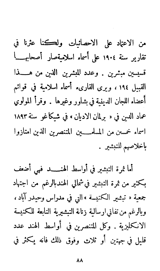 من الاعتماد على الإحصائيات ولكنا عثرنا في تقارير سنة 1904 على أسماء إسلامية صار أصحابها قسيسين مبشرين. وعدد المُبَشِّرِينَ الذين من هذا القبيل 194، ويرى القارئ أن أسماء إسلامية في قوائم أعضاء اللجان الدينية في بشاور وغيرها. وقرأ المولوي عماد الدين في «برلمان الأديان» في شيكاغو سنة 1893 أسماء خمسين من المسلمين المُتَنَصِّرِينَ الذين امتازوا بإخلاصهم للتبشير.