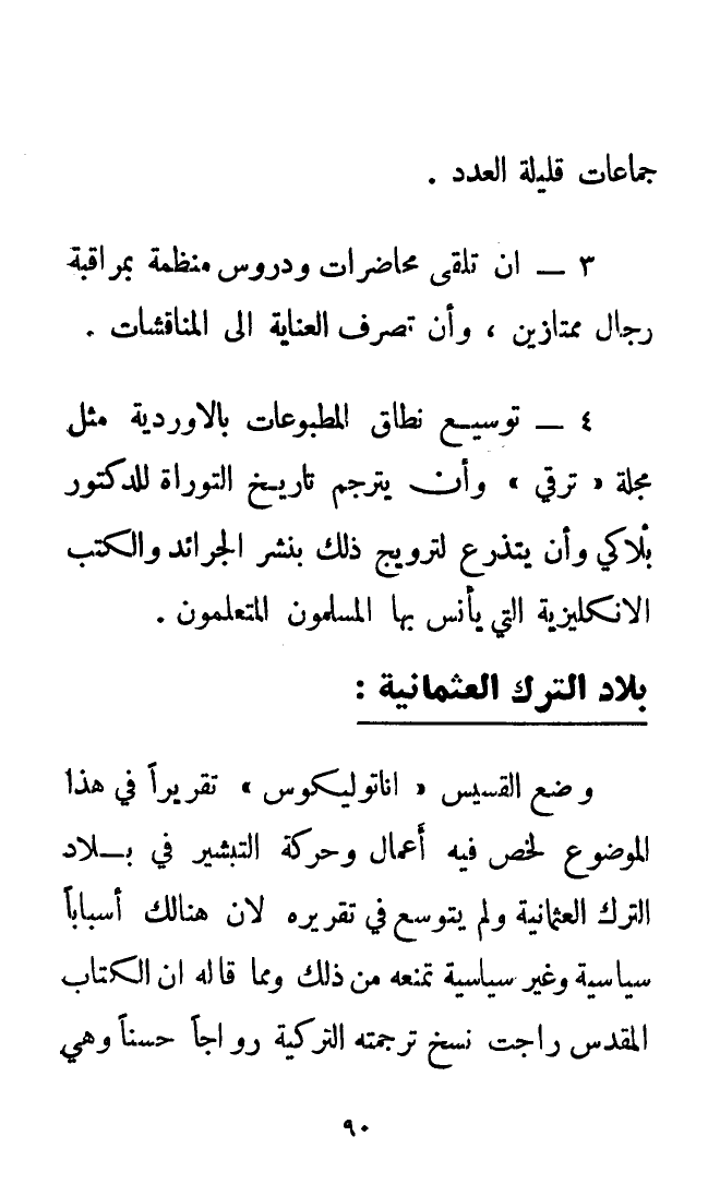 وضع القسيس «أناتوليكوس» تقريرًا في هذا الموضوع لخص فيه أعمال وحركة التبشير في بلاد الترك العثانية ولم يتوسع في تقريره لأن هناك أسبابًا سياسية وغير سياسية تمنعه من ذلك ومما قاله: إن الكتاب المقدس راجت نسخ ترجمته التركية رواجًا حسنًا وهي