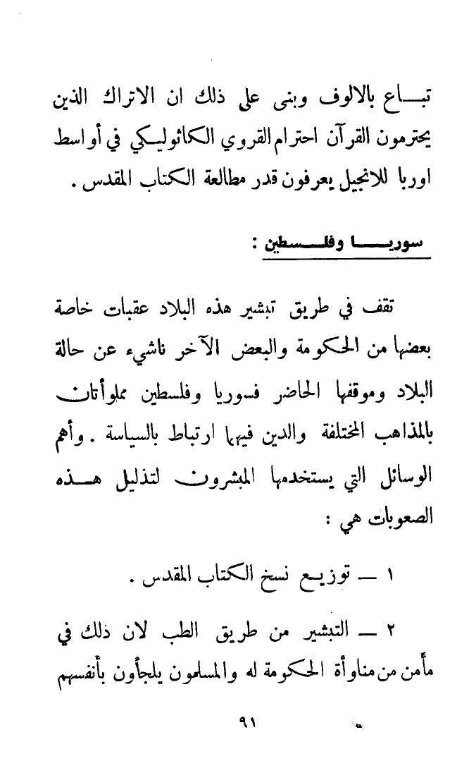 تقف في طريق تبشير هذه البلاد عقبات خاصة بعضها من الحكومة والبعض الآخر ناشئ عن حالة البلاد وموقفها الحاضر فسوريا وفلسطين مملوأتان بالمذاهب المختلفة التي يستخدمها المُبَشِّرُونَ لتذليل هذه الصعوبات هي:
