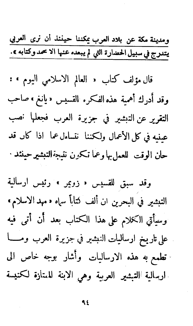 وقد سبق للقسيس «زويمر» رئيس إرسالية التبشير في البحرين أَنْ أَلَّفَ كتابًا سماه " مهد الإسلام " وسيأتي الكلام على هذا الكتاب بعد أن أتى فيه على تاريخ إرساليات التبشير في جزيرة العرب وما تطمع به هذه الإرساليات وأشار بوجه خاص إلى إرسالية التبشير العربية وهي الابنة الممتازة لكنيسة
