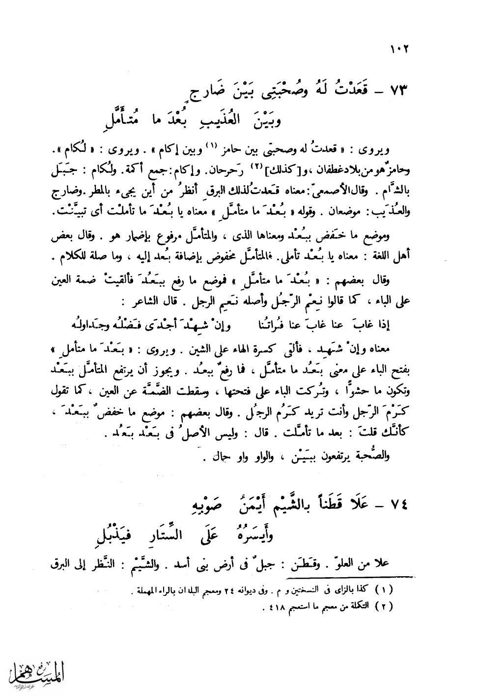 (قَعَدْتُ لَهُ وصُحْبَتِي بَيْنَ ضَارجٍ ... وبَيْنَ العُذَيبِ بُعْدَ ما مُتأَمّلِ)