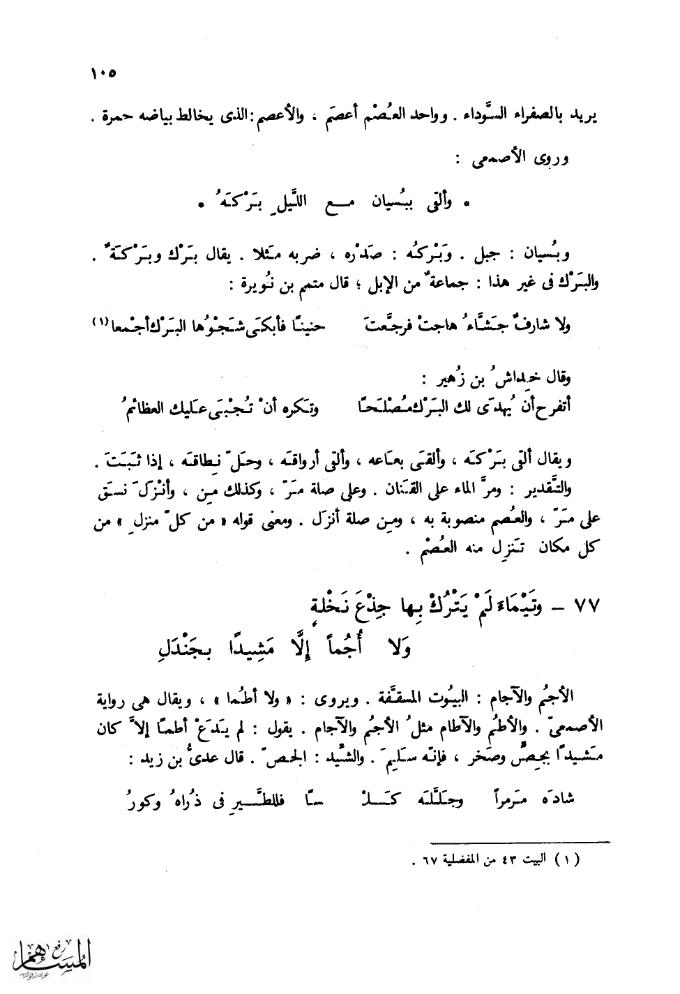 (وتَيْمَاءَ لَمْ يَتْرُكْ بِها جِذْعَ نَخْلةِ ... وَلا أُجُماً إِلاَّ مَشِيداً بجَنْدَلِ)