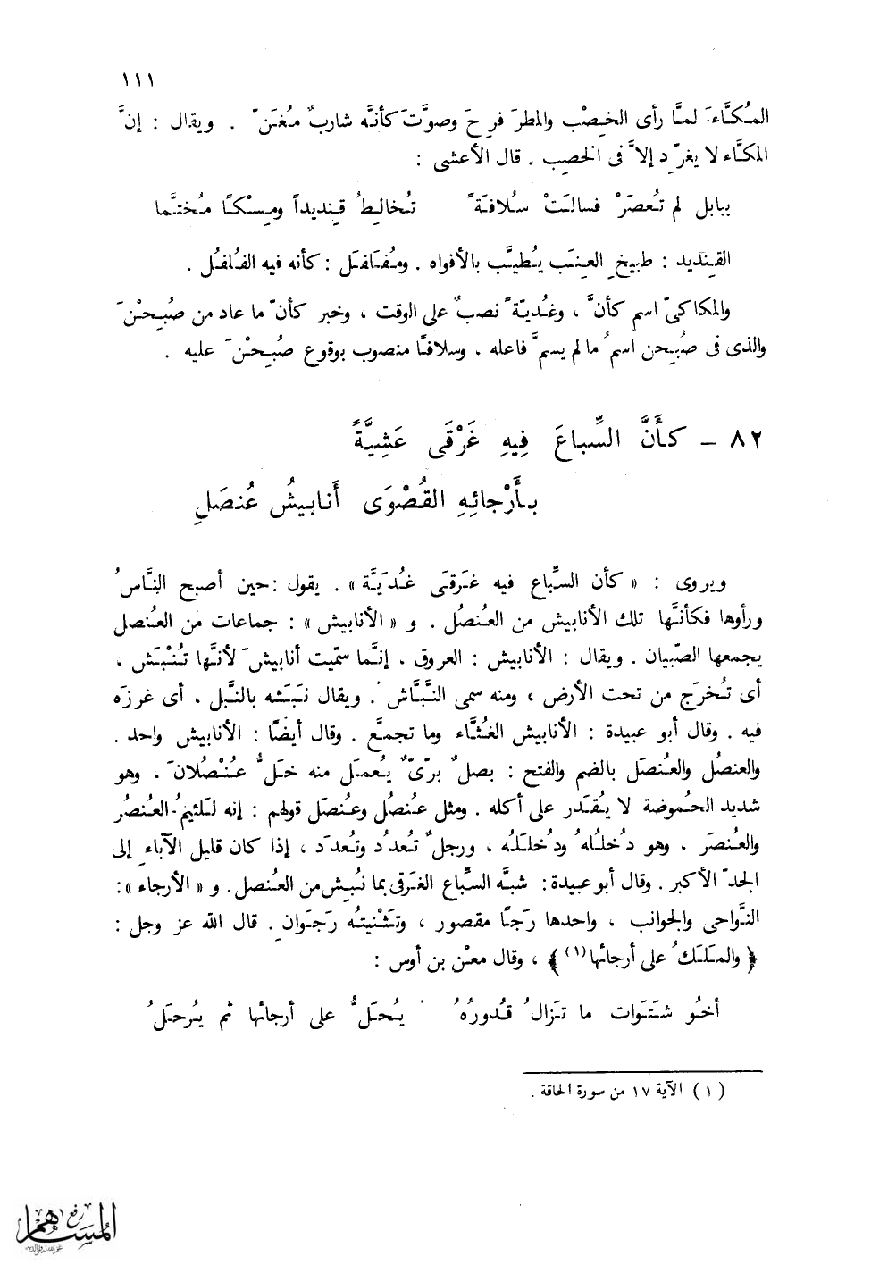 (كأَنَّ السِّباعَ فِيِه غَرْقَى عَشِيَّةً ... بأَرْجائِهِ القُصْوى أَنابيشُ عُنصَلِ)