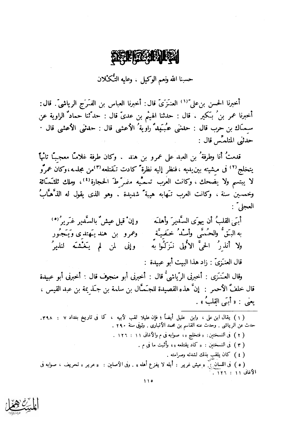 أخبرنا الحسن بن العنزي قال: أخبرنا العباس بن الفرج الرياشي. قال: أخبرنا عمر بن بكير، قال: