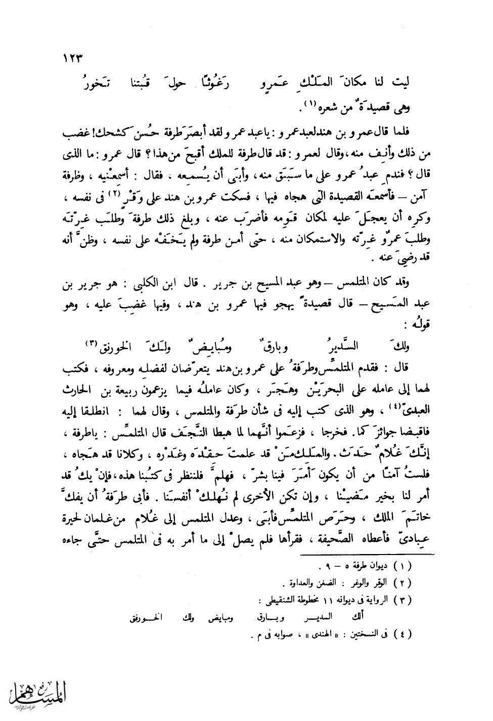 النجف قال المتلمس: يا طرفة، إنك غلام حدث، والملك من قد علمت حقده وغدره، وكلانا قد هجاه،