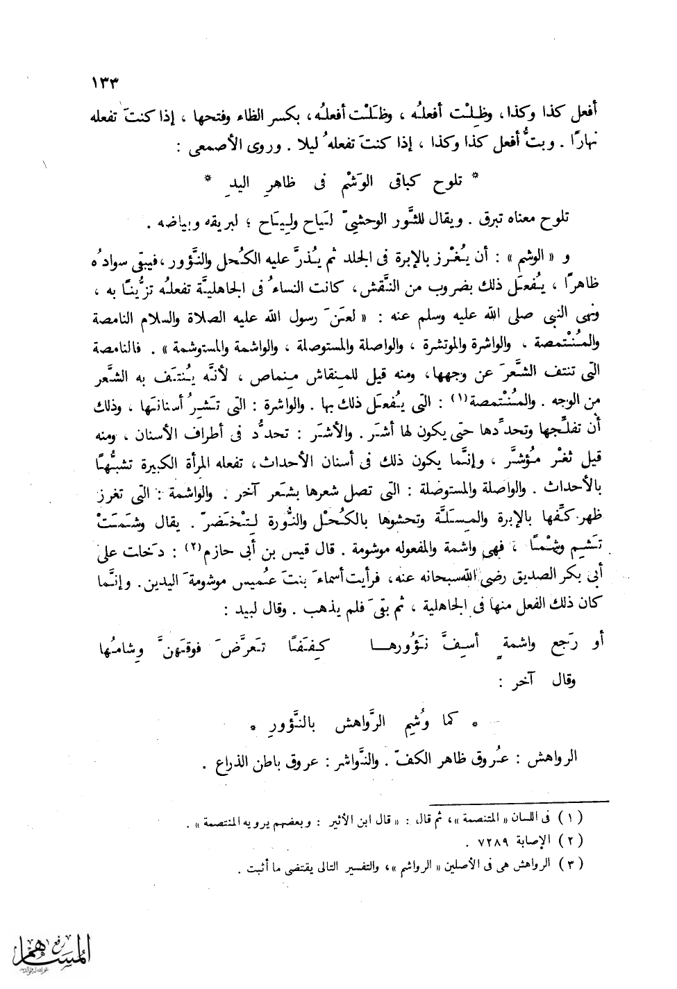 بضروب من النقش، كانت النساء في الجاهلية تفعله تزينا به، ونهى النبي صلى الله عليه وسلم عنه،