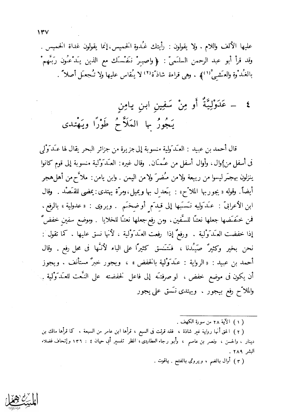 (عَدَوْلِيّةٌ أو مِنْ سَفِينِ ابنِ يا مِنٍ ... يَجُورُ بها المَلاَّحُ طَوْراً ويَهْتدِي)