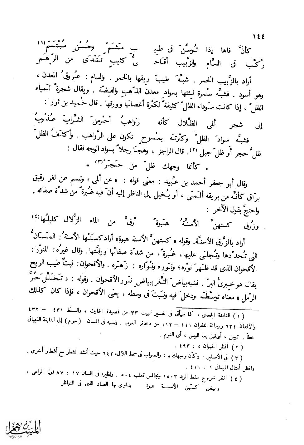 فشبه سواد الظل وكثرته بمسوح تكون على الرواهب. وأكثف الظل ظل حجر أو ظل جبل. قال