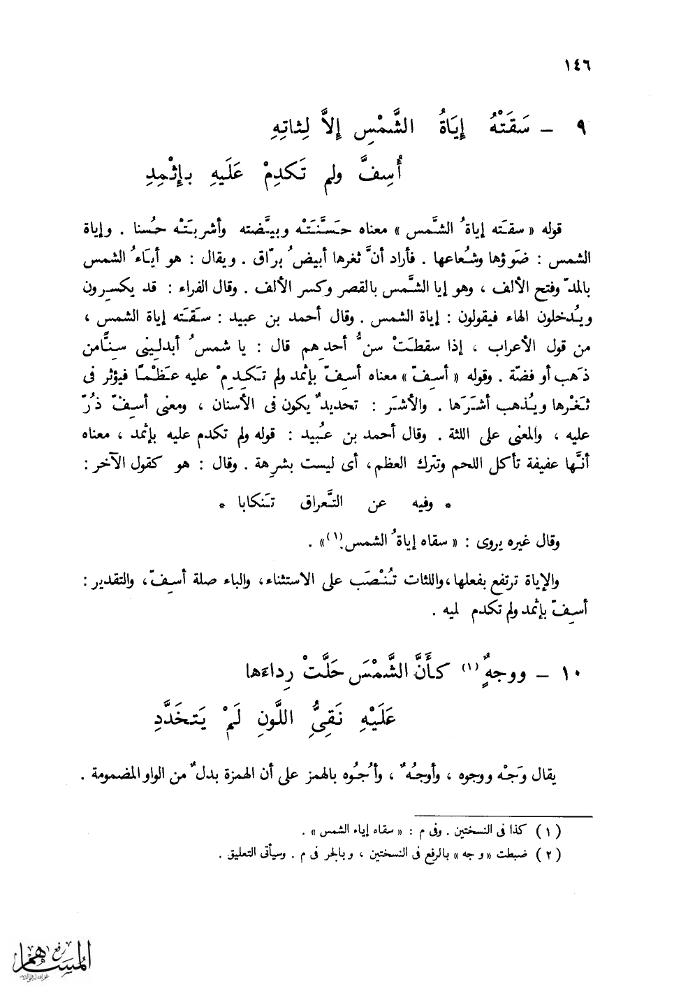 (سَقَتْهُ إِيَاةُ الشَّمْس إِلاَّ لِثاتِهِ ... أُسِفَّ ولم تَكدِمْ عَلَيهِ بإِثْمِدِ)
