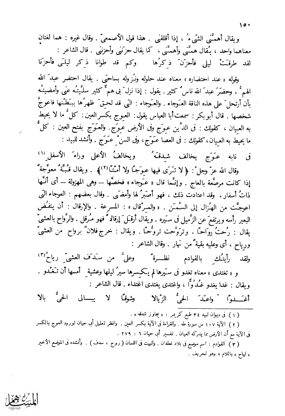 العين: كل ما يحيط به العيان، كقولك: في العصا عوج وفي السن عوج. وأنشد للبيد:
