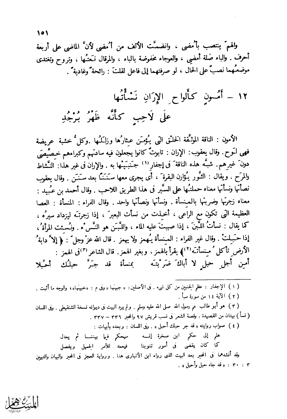 (أَمُونٍ كأَلواحِ الإِرَانِ نسَأْتُها ... علَى لاَحِبٍ كأَنَّه ظَهْرُ بُرْجُدِ)