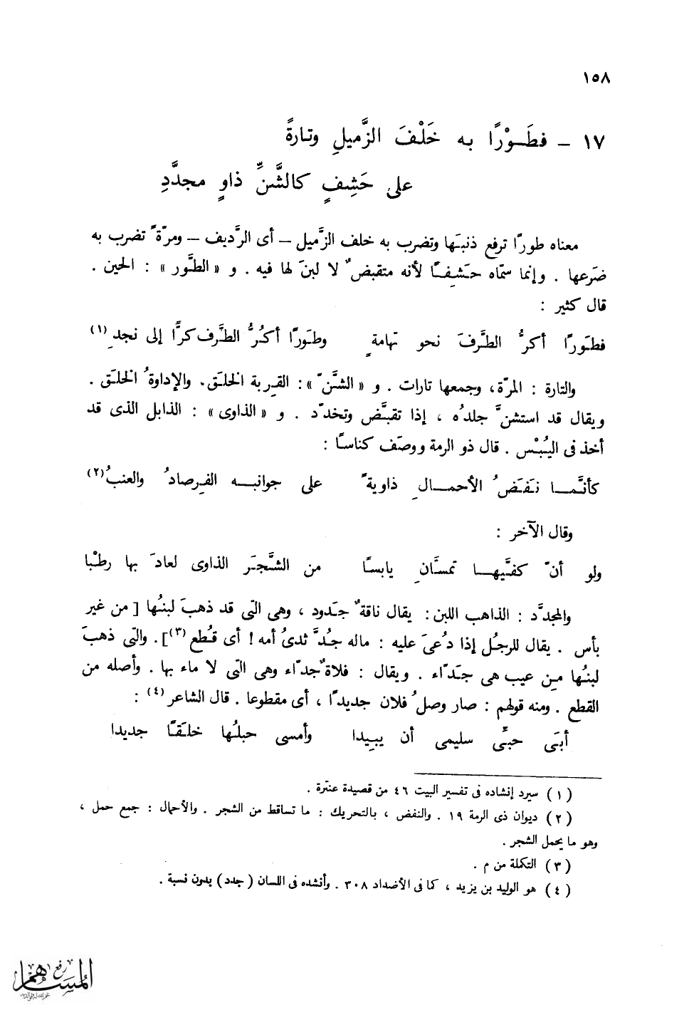 (فطَوْراً به خَلْفَ الزَّميلِ وتارةً ... على حَشِفٍ كالشَّنِّ ذاوٍ مجدَّدِ)