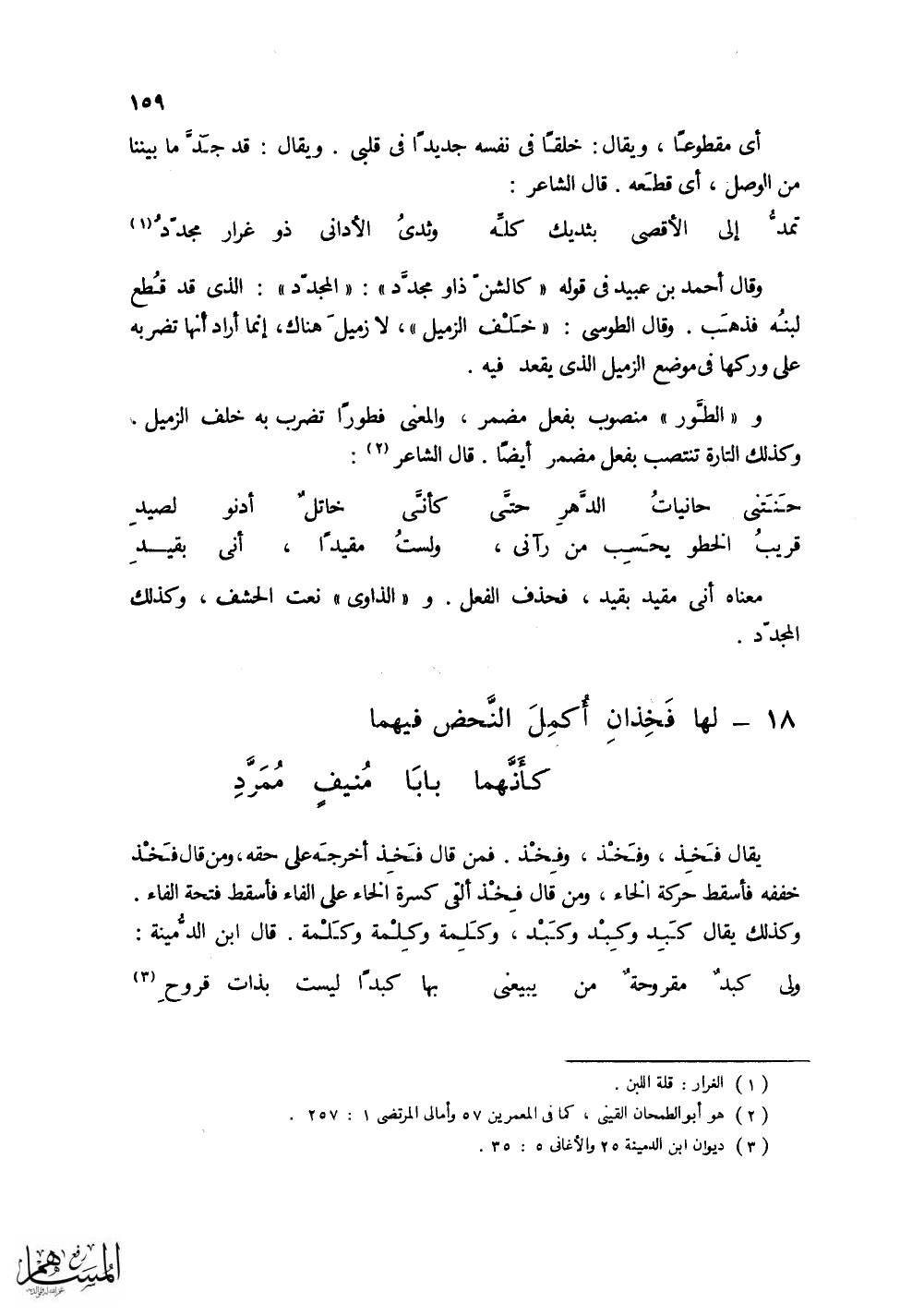 وقال أحمد بن عبيد في قوله (كالشن ذاو مجدد): (المجدد): الذي قد قطع لبنه فذهب. وقال الطوسي: