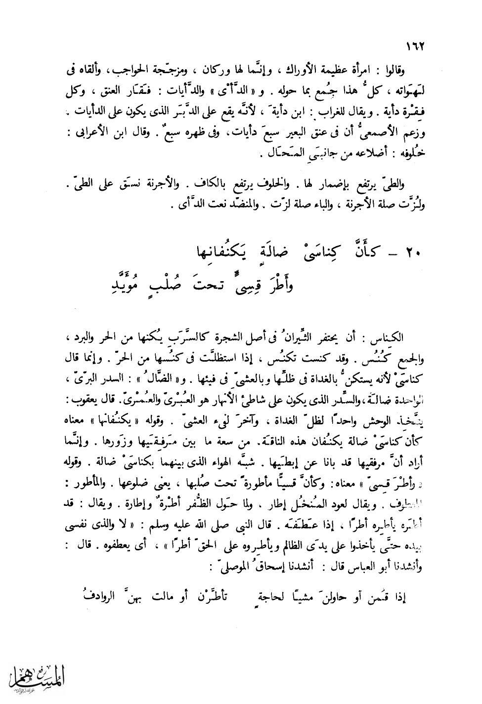 (كأَنَّ كِناسَيْ ضالَةٍ يَكنُفانِها ... وأَطْرَ قِسِيٍّ تَحْتَ صُلْبٍ مُؤَيَّدِ)