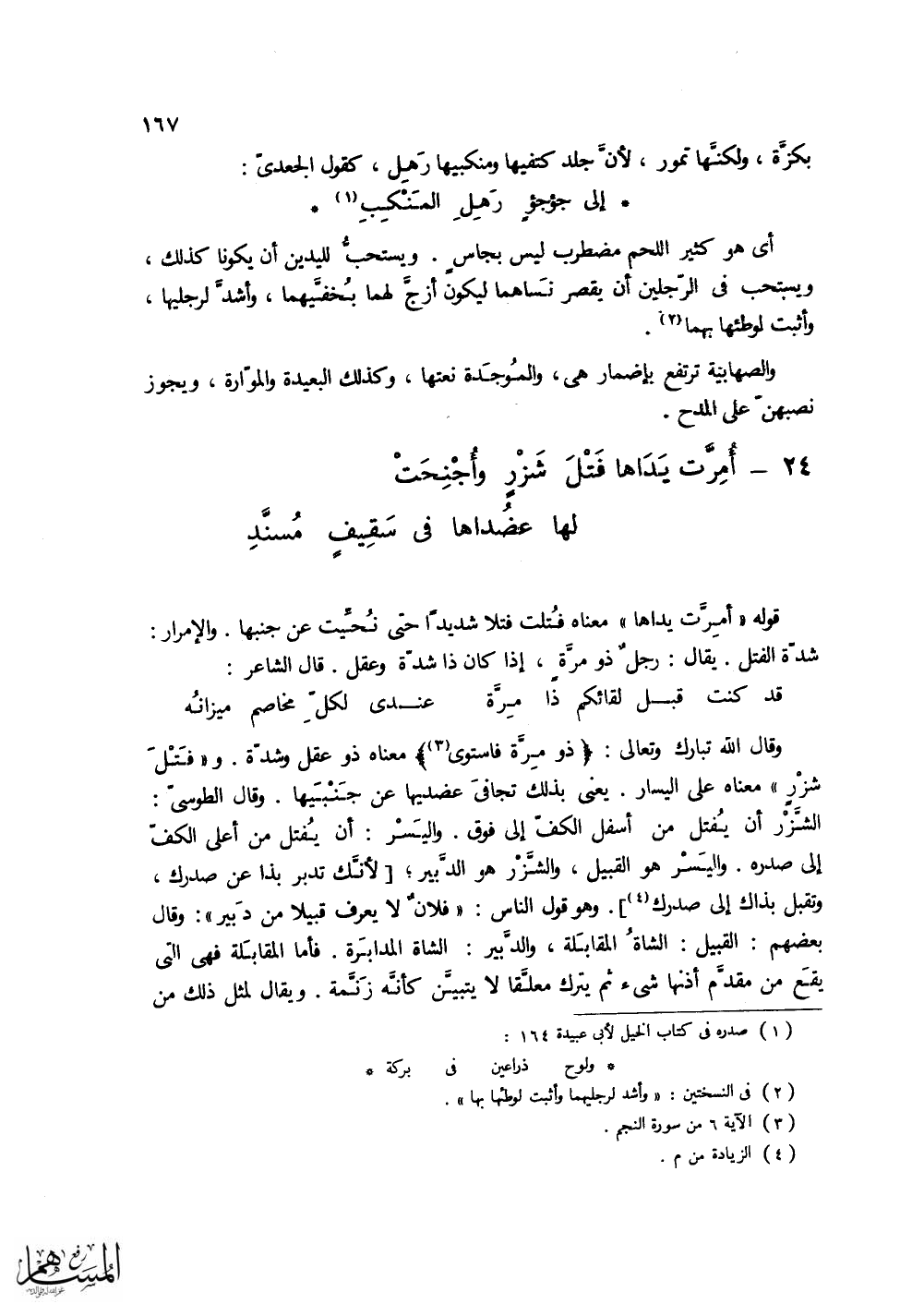 (أُمِرَّت يَدَاها فَتْلَ شَزْر وأُجْنِحَتْ ... لها عَضُداها في سَقيفٍ مُسندِ)