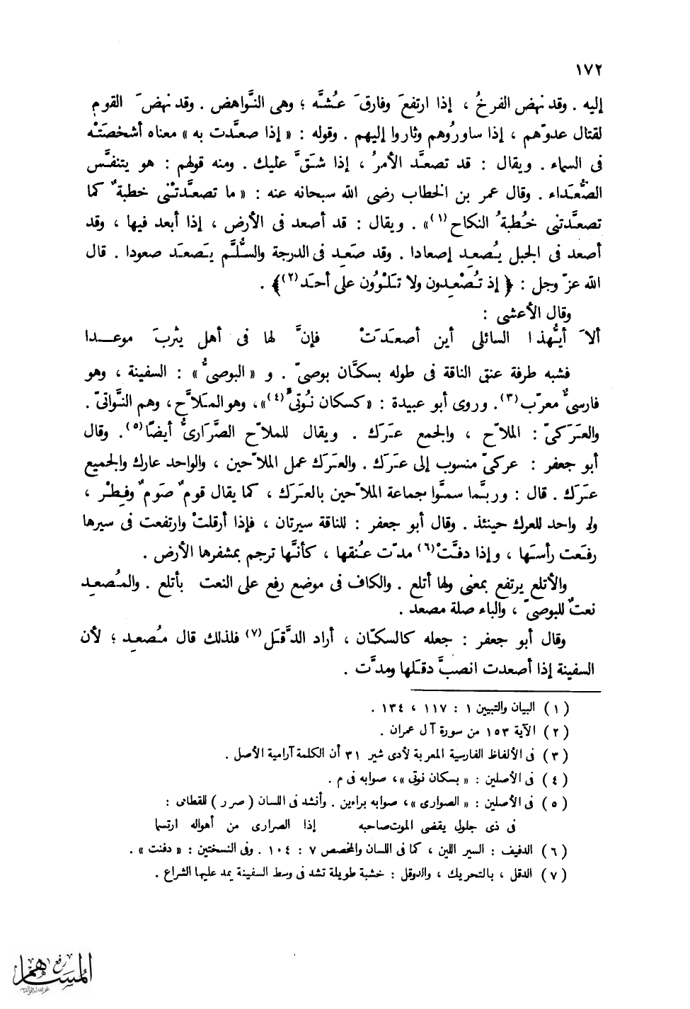 فشبه طرفة عنق الناقة في طوله بسكان بوصي. و (البوصي): السفينة، وهو فارسي معرب. وروى