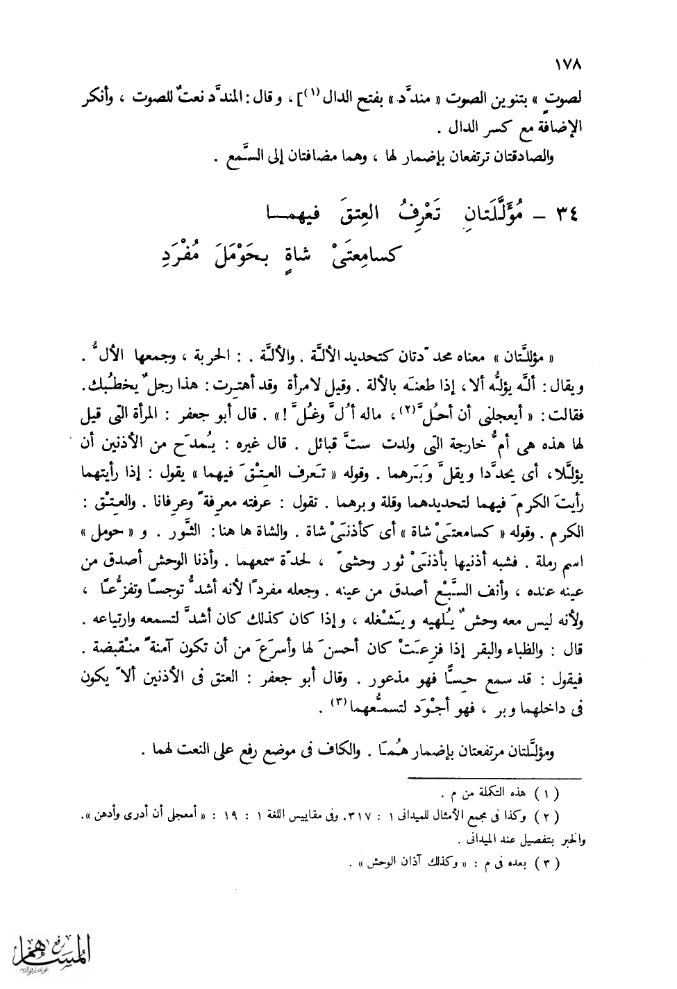 (مُؤَلَّلتانِ تَعرِفُ العِتْقَ فيهما ... كسامِعتَيْ شاةٍ بحَوْمَلَ مُفْرَدِ)