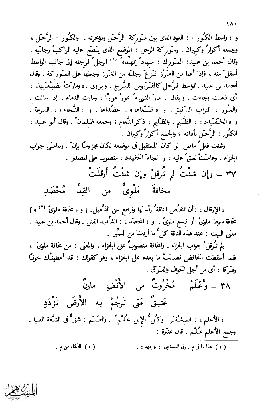 (وأَعْلمُ مَخْرُوتٌ من الأَنْفِ مارِنٌ ... عَتيقٌ مَتى تَرجُمْ به الأَرضَ تَزْدَدِ)