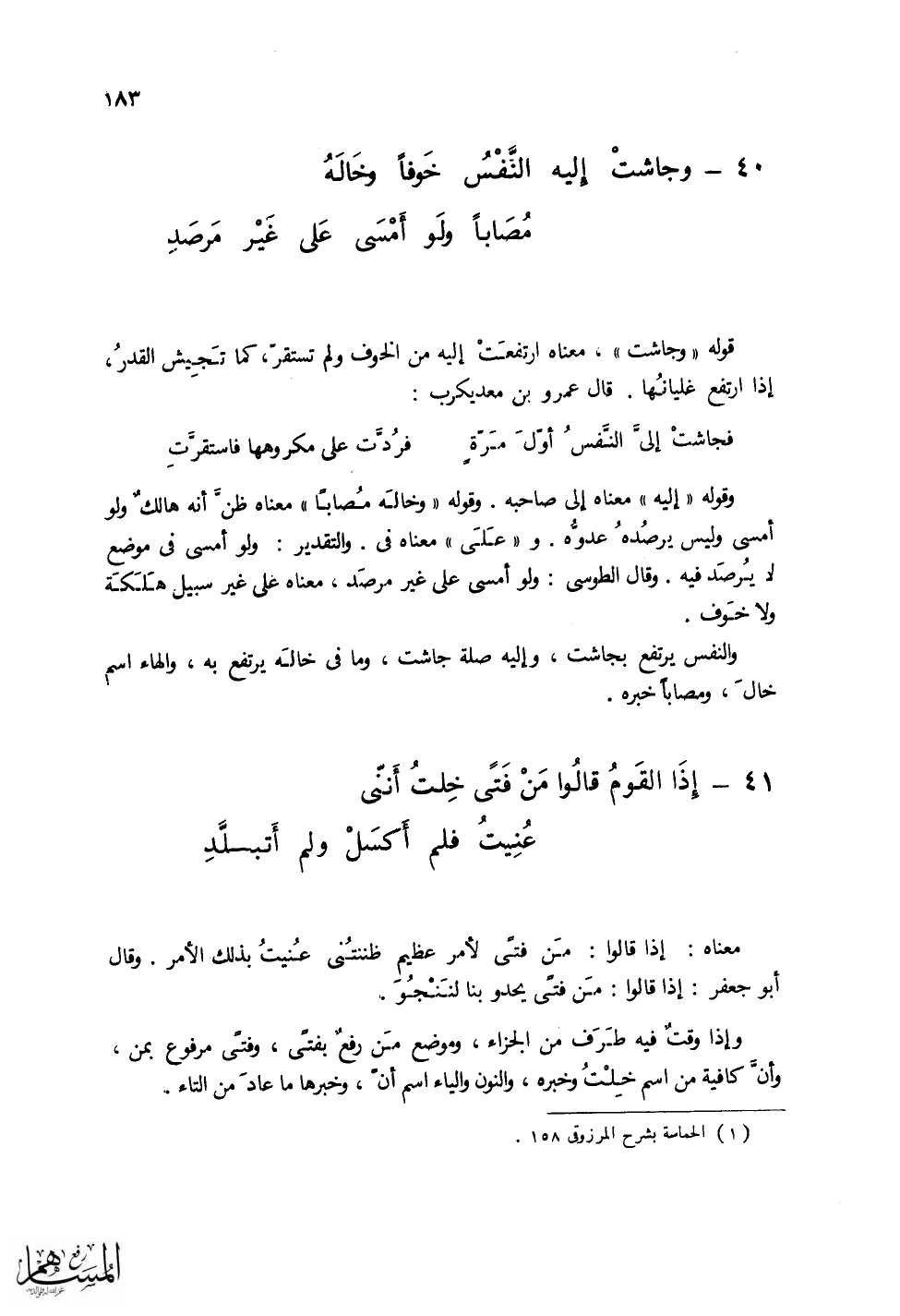 (وجاشتْ إليه النَّفْسُ خَوفاً وخَالَهُ ... مُصَاباً ولَو أَمْسَى عَلى غَيْرِ مَرصَد)