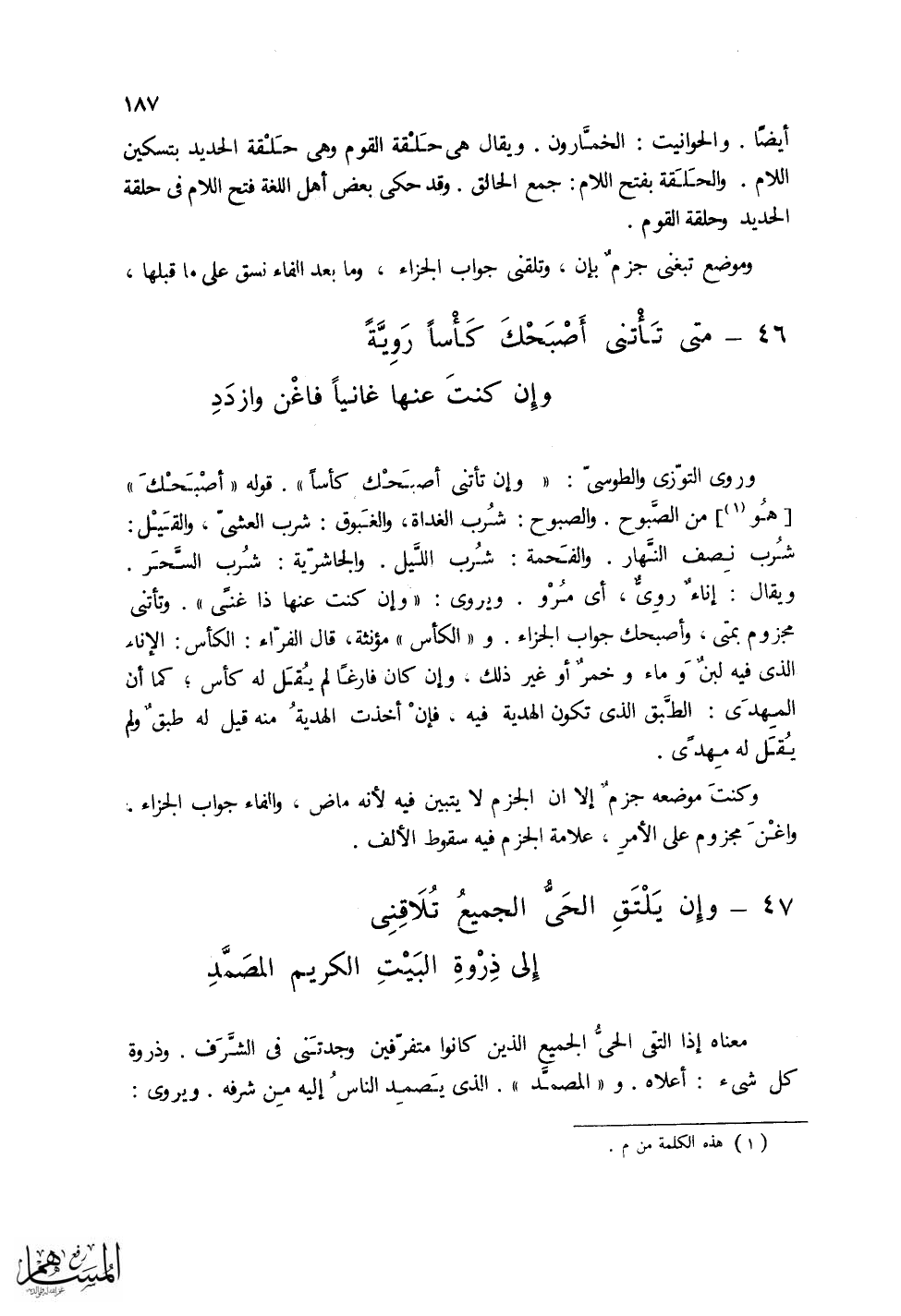 (وإِنْ يَلْتَقِ الحَيُّ الجمِيعُ تُلاَقِني ... إِلى ذِرْوةِ البَيْتِ الكريم المصَمَّدِ)