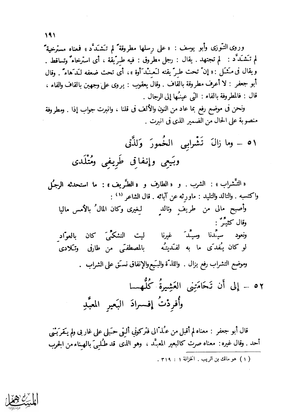 (وما زالَ تَشْرابِي الخُمورَ ولَذَّتي ... وبَيعي وإِنفاقِي طَرِيفي ومُتْلدِي)