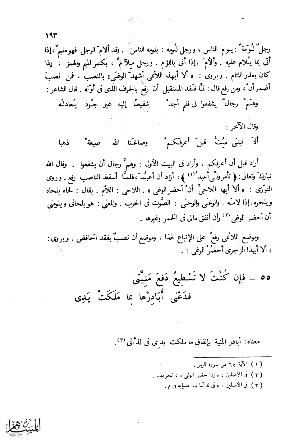 الميم والهمز، إذا كان يعذر اللئام. ويروى: (ألا أيهذا اللائمي أشهد الوغى) بالنصب، فمن نصب