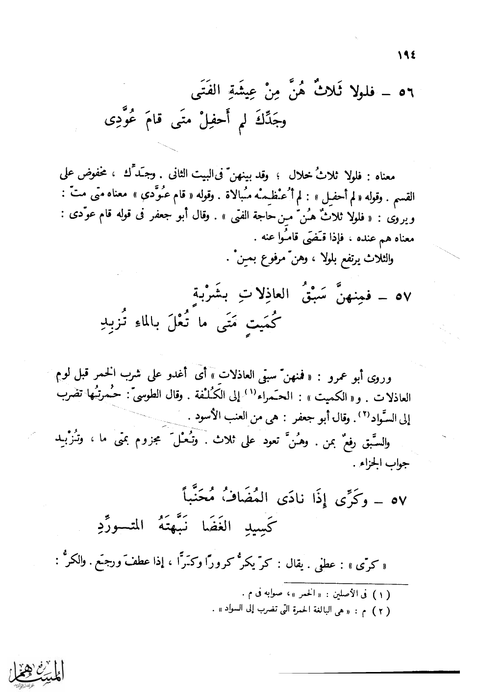 (فلولا ثلاثٌ هُنَّ مِنْ عِيشةِ الفتَى ... وجَدِّكَ لم أَحفِلْ متَى قام عُوَّدِي)