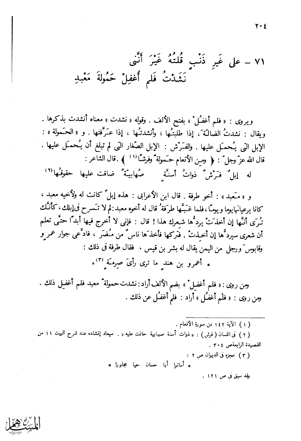 (على غَيرِ ذَنْبٍ قُلتُهُ غيْرَ أَنَّني ... نَشَدْتُ فَلم أُغفِلْ حَمُولةَ مَعْبدِ)