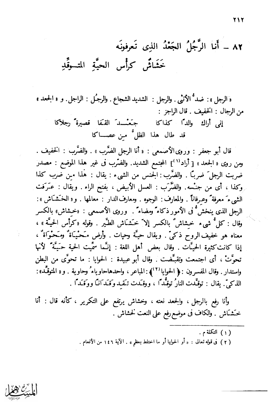 (أَنا الرَّجُلُ الجعْدُ الذي تَعرفونه ... خَشَاشٌ كرأْس الحيَّة المتوقْدِ)
