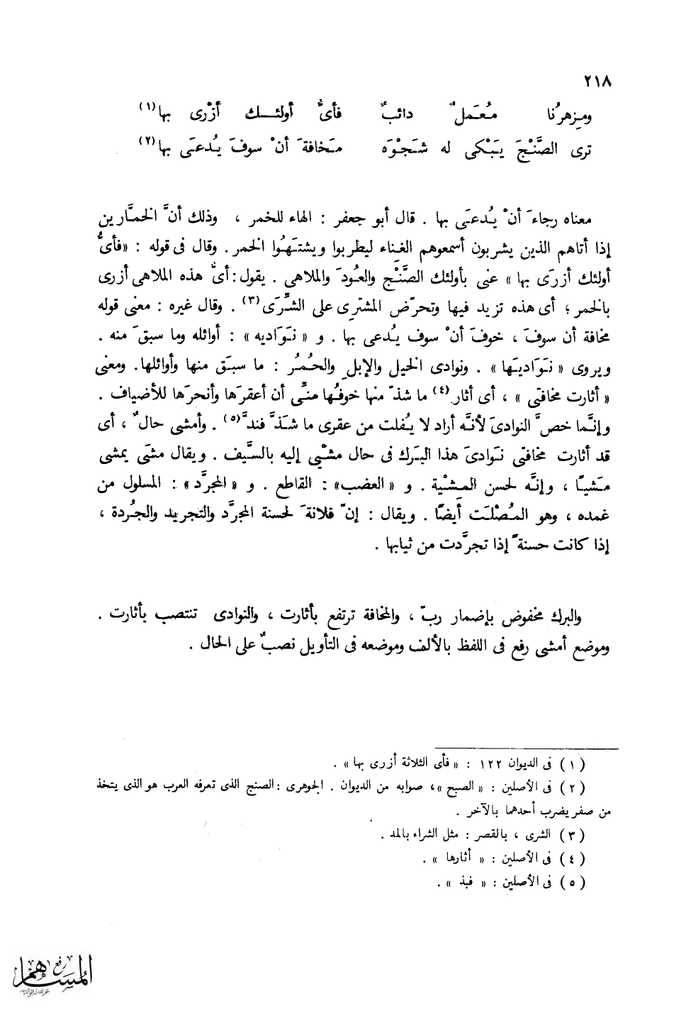 أسمعوهم الغناء ليطربوا ويشتهوا الخمر. وقال في قوله (فأي أولئك أزرى بها) عنى بأولئك الصّنج