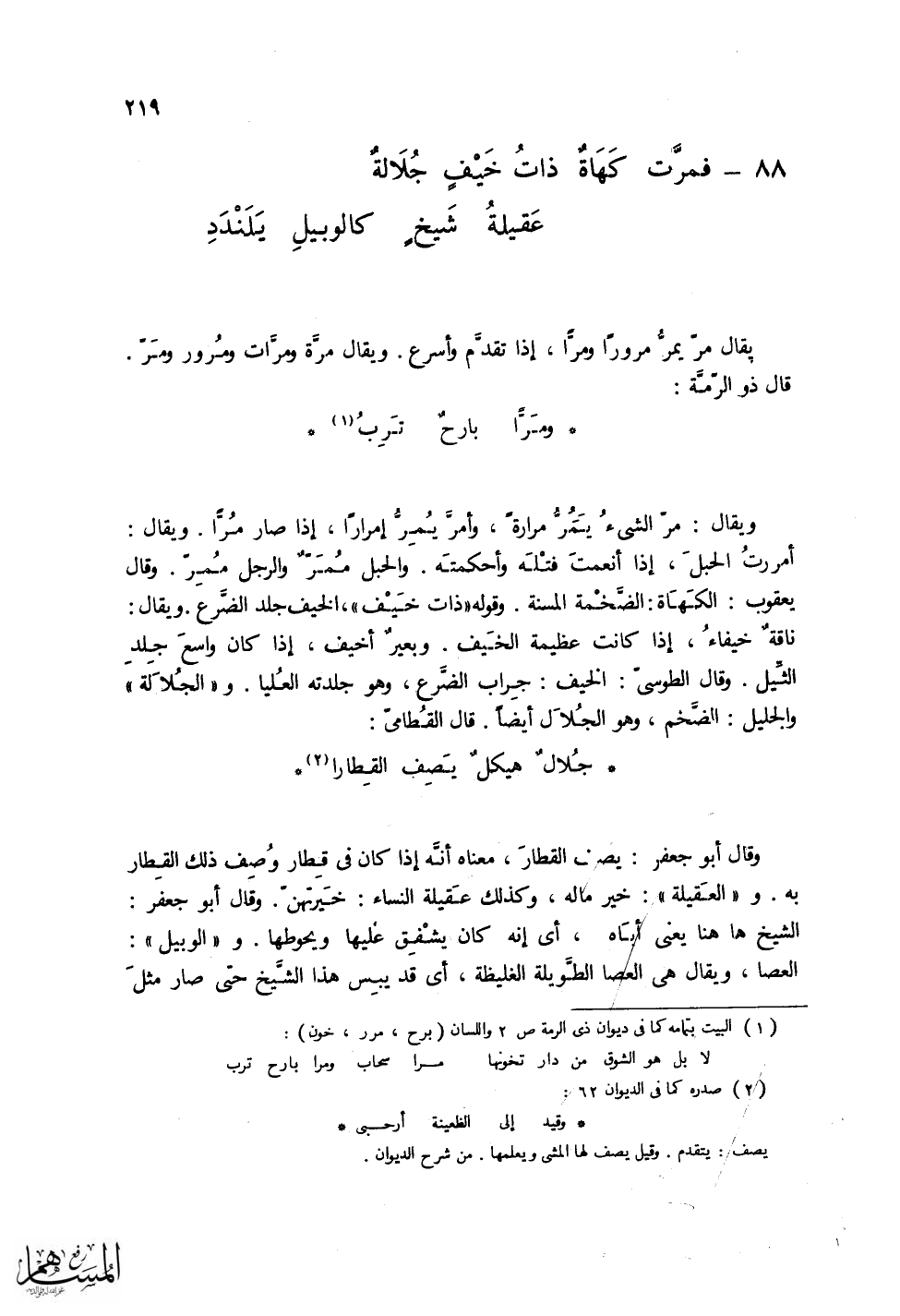 (فمرَّت كَهَاةٌ ذاتٌ خَيْفٍ جُلاَلةٌ ... عَقيلةُ شيخٍ كالوبيلِ يَلَنْدَدِ)