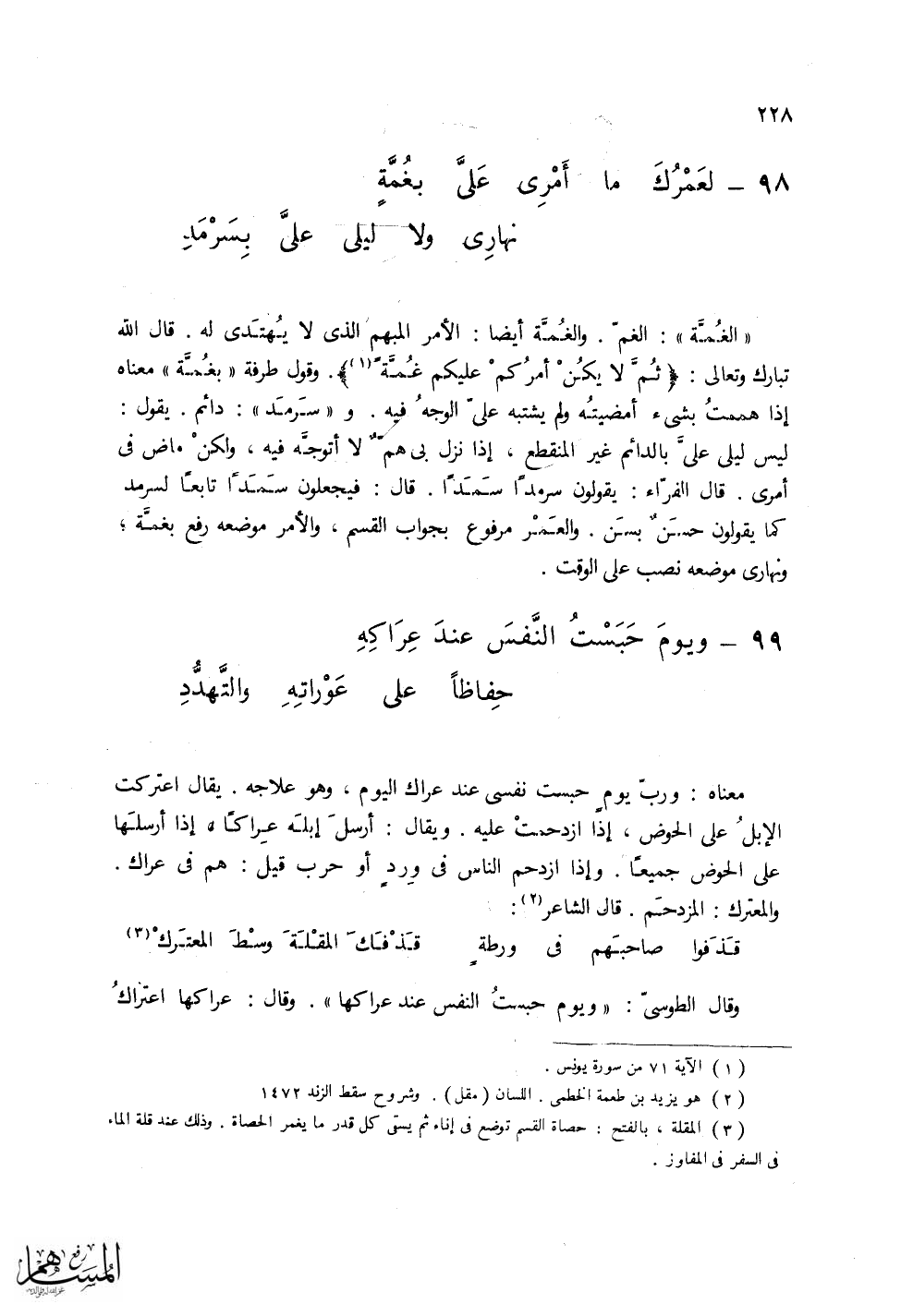 (لعَمْرُكَ ما أَمرِي عَلَّى بغُمَّةٍ ... نهاري ولا ليلِي عليَّ بِسَرْمَدِ)